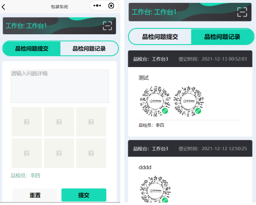 包裝車間 每個質(zhì)檢工作臺都會有一個獨立二維碼。質(zhì)檢人員通過手機(jī)微信掃一掃或者小程序內(nèi)掃碼工具都可以進(jìn)入質(zhì)檢問題提交頁面。
