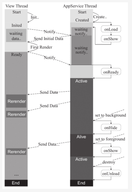 如圖2-8,線程啟動(dòng)后視圖層和邏輯層相互監(jiān)聽,當(dāng)邏輯層線程觸發(fā)onLoad、onShow方法后會(huì)把初始數(shù)據(jù)data傳送給視圖層線程,視圖層完成第一次渲染后觸發(fā)邏輯層onReady方法,代表頁面已經(jīng)準(zhǔn)備妥當(dāng),之后我們便可通過setData方法主動(dòng)觸發(fā)視圖層渲染。當(dāng)頁面被調(diào)往后臺(tái)時(shí),觸發(fā)onHide方法,這時(shí)邏輯層線程并沒有銷毀,我們?nèi)匀豢梢酝ㄟ^代碼控制視圖層渲染,只是可能不會(huì)在界面上表現(xiàn)出來。當(dāng)頁面從后臺(tái)回到前臺(tái)時(shí),觸發(fā)onShow方法,最后當(dāng)頁面銷毀時(shí),觸發(fā)onUnload方法。